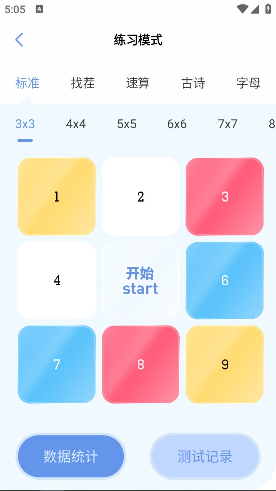 舒尔特方格帮助用户提高阅读能力以及注意力的软件,它的界面干净简洁,功能相当强大,包括相当丰富的训练内容,内容包括标准经典版、古诗成语字母等,可选择的非常多,最有效、最科学的注意训练方法。在指定时间内,按从小到大的顺序单击数字。
