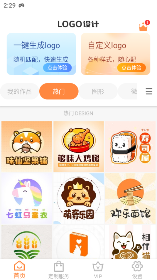 1、首先打开软件之后,你可以在首页中查看到一键生成logo、自定义logo的功能。
