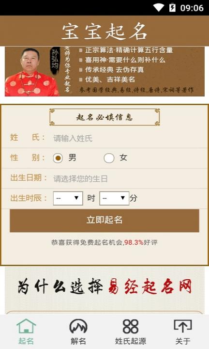 1 点击起名,输入姓氏,性别和出生日期时间,软件采用大数据技术为您自动起名。