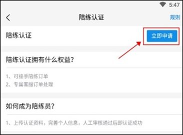 2、进入“陪练认证”环节后,请您仔细阅读相关规则,然后点击“立即申请”按钮。