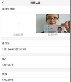 3、随后在“陪练认证”专区里,请您填写您的身份证件信息,以及联系方式和手持证件照,点击“提交审核”按钮。在接下来的数天内,请您耐心等待审核结果。