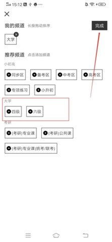 2、接下来,在弹出的页面中查找并勾选"大学"选项,将其添加至您个人的频道中,并随后点击右上角的"完成";