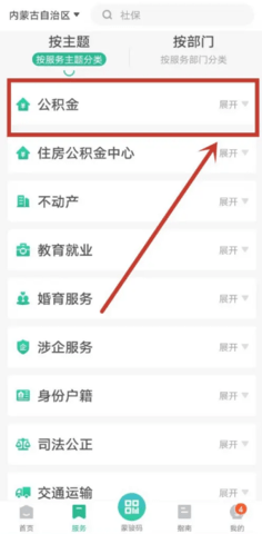 1、在手机上打开内蒙古公积金软件,按主题选择公积金大类业务。
