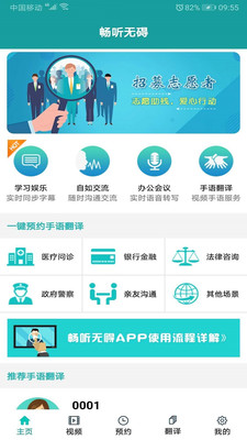 听障人士通过提前预约、远程视频方式与专业的手语翻译进行沟通,再由手语翻译和医生、政府工作人员、警察、窗口办事人员、亲友进行语音沟通。解决听障人士就医、办事难问题,达到辅助沟通的目的。