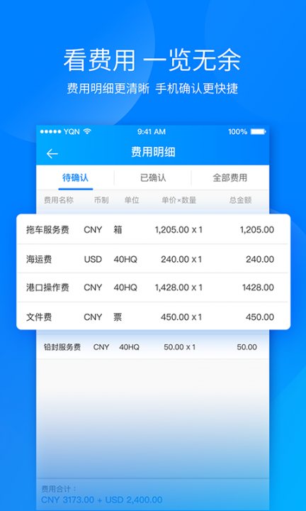 每票物流订单的费用明细一览无余,清晰透明!通过手机即可快捷确认费用,更加便捷。