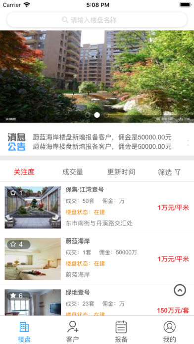 楼盘详情、客户信息一网打尽,报备带看后保护期内客户动态随时掌握,最大化的保护经纪人劳动成果。佣金业绩、热门活动尽在掌握。