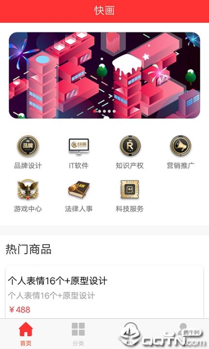 快画主营类目:品牌设计,IT软件,知识产权,营销推广,游戏中心,法律人事,科技服务,出租美工设计人员。