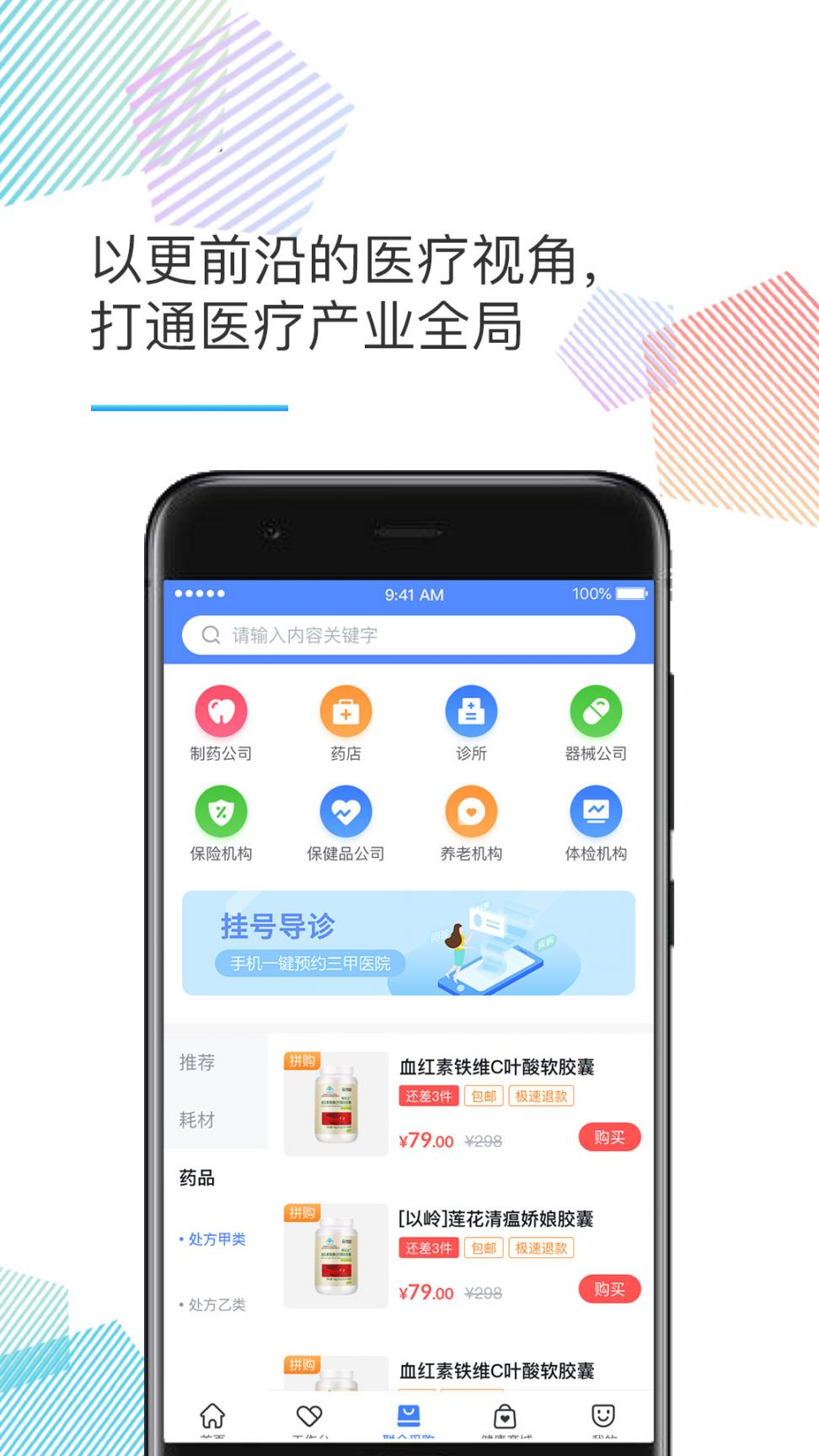 平台集合了诊所、药店、养老机构、体检机构、制药公司、器械公司、保险机构、保健品公司等医疗相关产业资源。