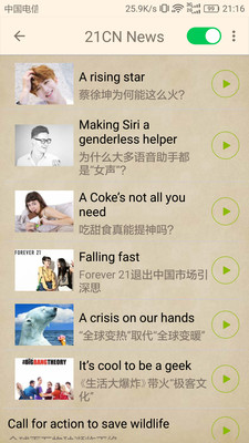 7、提供课外英语听说训练:双语新闻、美国口语俚语、经典口语6000句、英语电台等等。轻松拓展,及时掌握新信息、新知识。