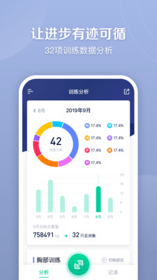 32项训练数据统计分析,训练月报、训练部位分析、动作分析,应有尽有。