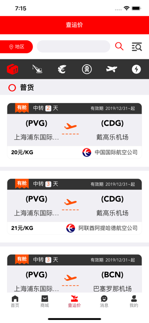 世双空运app,使用它您能够了解世界各地的空运服务,在这里每天都能查看最新的空运物流信息,并且还可以在线了解不同的价格,以及运输的时间。如果您需要空运,在此直接在平台上登记,会有人为您提供服务哦!