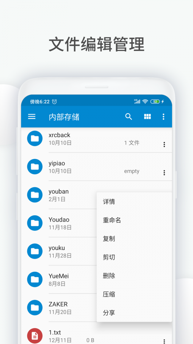 6.全面的文件操作支持,删除,剪切,拷贝,新建,排序,重命令,分享,发送等。