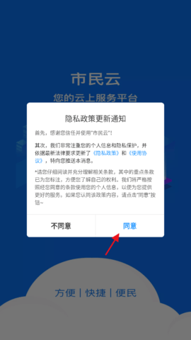 1、打开手机上的市民云大连健康码app,点击同意用户协议进入。