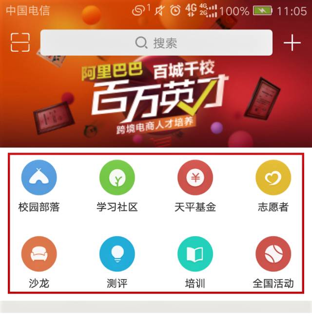 点击首页上部及底部显示的“部落”“活动可以随时随地了解到学校的情况。