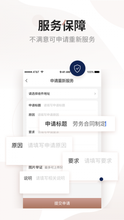 拟订审核合同,代写文书,案件委托,约见律师,律师函等。