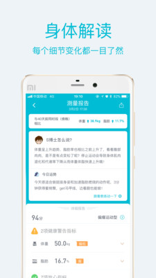 配合智能体脂秤,全面检测体脂率、内脏脂肪指数等身体指标,结合体重、体围数据进行腰臀比及身型状态分析,直观了解您最关心的身体数据,每个细微变化都一目了然;