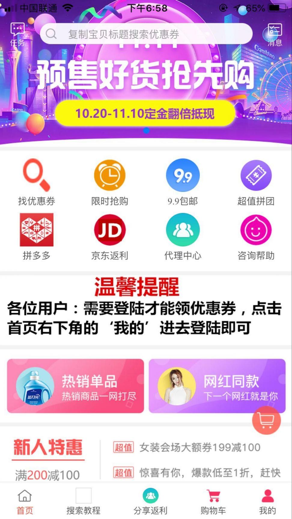 1、实惠联盟app是一款功能强大的购物软件,通过整合淘宝和京东的优惠资源,帮助用户省钱,让购物不再是负担。