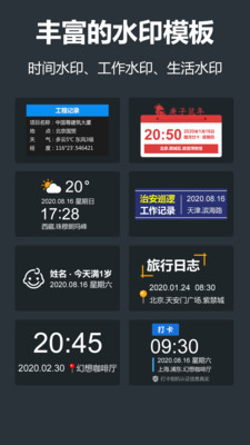 时间相机水印、天气相机水印、经纬相机水印、工程相机水印、微商相机水印、美食相机水印、旅行相机水印。