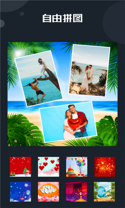 - 自由拼图:选择多张图片在背景中自由移动摆放位置制作特色拼图