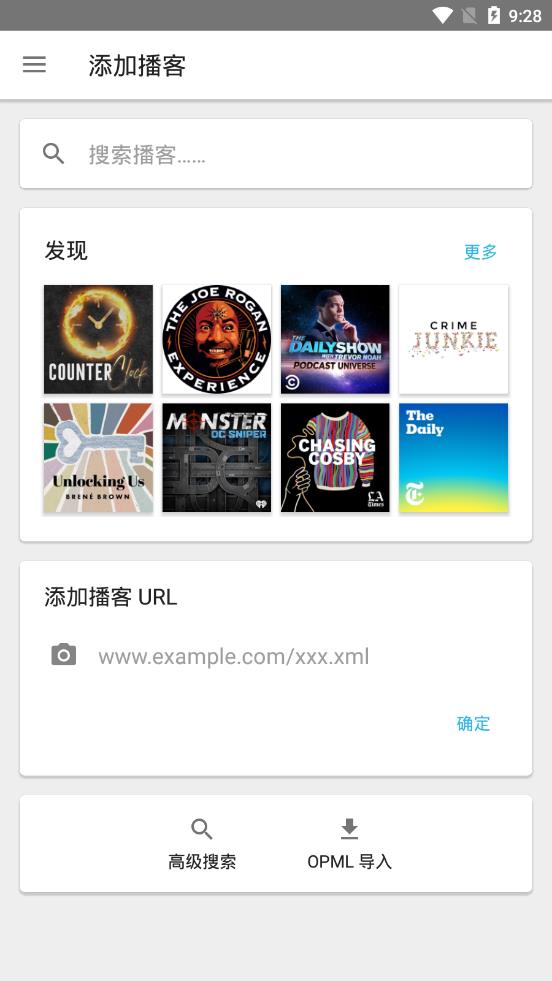2、多种方式订阅播客节目,包括关键字搜索、URL输入、二维码扫描以及OPML文件导入导出。灵活的订阅模式让用户轻松管理个人播客库。