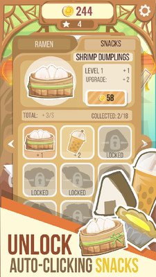 3、通过游戏中的星星,玩家可以免费解锁所有点击器升级项目、自动点播小吃、背景和配件,创建您理想中的拉面店。