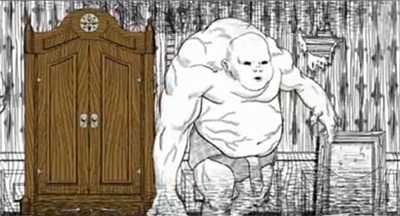3、前行不久后将迎来本章节的关键遭遇——一个体型巨大的怪物登场。此时应立即躲进附近的衣柜中避险。观察可知,该怪物外形如同巨婴,甚至穿着尿不湿,象征着某种未成熟的心理投射,具有强烈的象征意义。