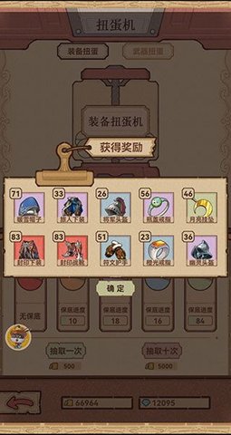 每个扭蛋花费500金币,十次连抽5000金币,是目前获得装备的主要方式之一,装备总共有白、蓝、紫、橙、红,终焉6种品质。