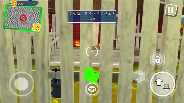 3、玩家需要在场景中寻找可用道具——例如一个木箱。找到后将其搬运至栅栏前方,并放置在合适位置。随后,点击屏幕上出现的【点击以跳】提示,角色便会借助箱子翻越栅栏,顺利进入下一区域。