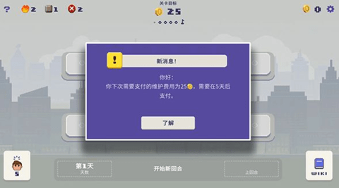 2、游戏中以天数作为进度,消息提示我们需在5日后支付25金币的维护费用,点击【了解】便可继续游戏进程。
