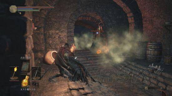 在营火“高墙边塔”出来后进入建筑物下一层,走出天台经过异变敌人的楼梯下去的建筑物中,在长枪骑士把守的小巷左边房间里面
