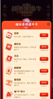 1、用户可以通过签到、邀好友、关注、刷微博、看视频、以及喊“牛”得卡等多种不同的方式获得福牛卡。