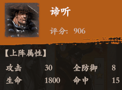 上阵属性:攻击30,全防御8,生命1800,命中15,收集属性暴击抵抗28。