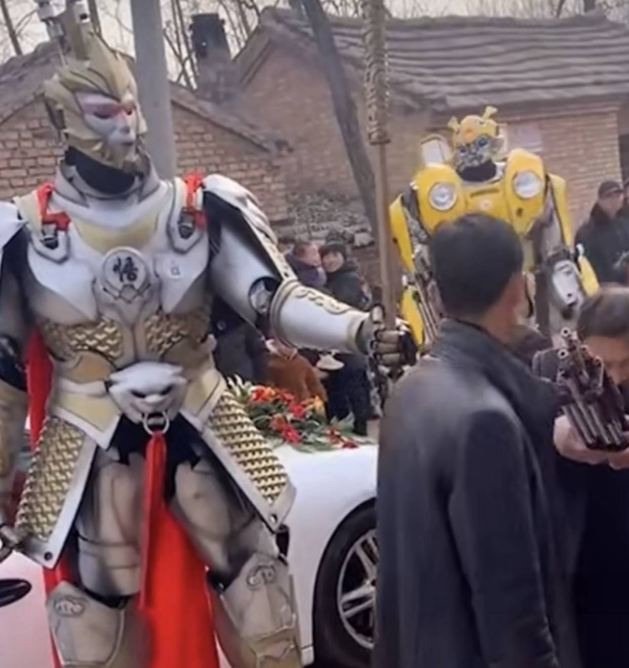 2022年的第一天,河南商丘的一位新郎用大黄蜂和齐天大圣的机甲去村里接亲,场面极其震撼,引起了村民的强烈围观。