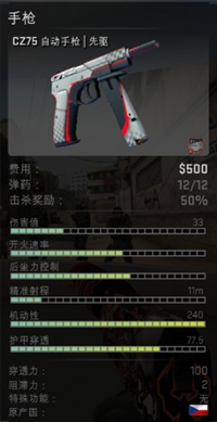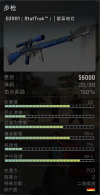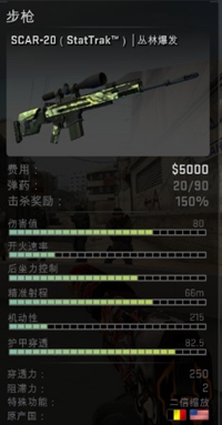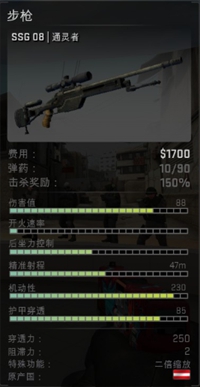 通用半自动狙击步枪,弹容量10发,威力小于AWP;射击有护甲单位身体无法一枪击杀,但可跳跃射击。