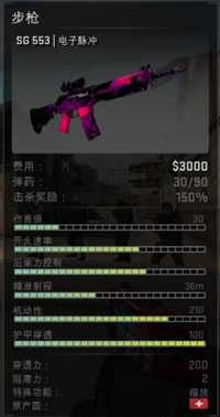 警用突击步枪,有1倍放大镜;伤害较高单发精准,但后座力也如SG553一般极难控制弹道。