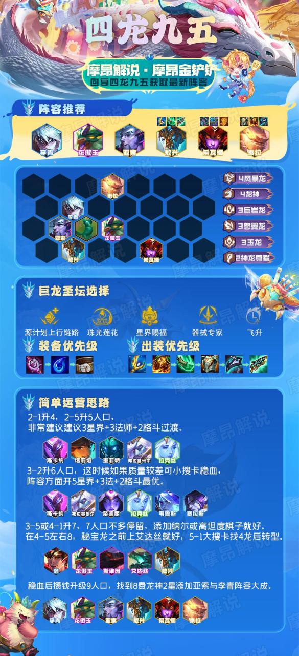 这几天兄弟们一直想让我写四龙,但其实这套阵容对经济运营要求比较高,其实如果运营能力不够,不是特别建议选择。但兄弟们问了就必须安排。今天摩昂就与大家好好地谈一下这套——四龙九五。