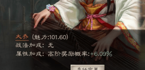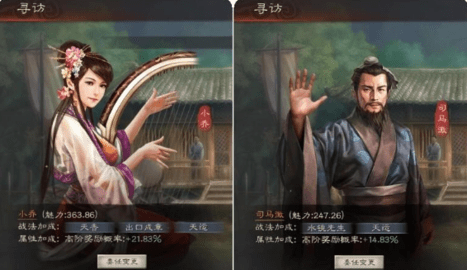 寻出高阶奖励的几率是4.5%→9%,小乔和司马徽相对来说是最适合当寻访使的,高阶奖励自然包括五星橙将。司马徽作寻访使最容易出名将,因为司马徽自带战法本身就和寻访有关系,除了自带战法还要记得学习出口成章,这个战法是加魅力值的,魅力值越高,寻访高阶奖励(也就是橙色奖励)的概率也越大,配合自带战法的加成,所以他是所有武将里面高阶寻访几率最高的武将。