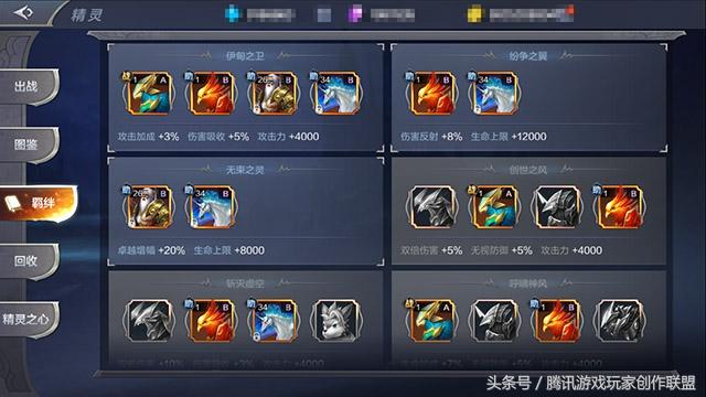 精灵羁绊开始生效,三项加成全部获得,如果你在收集四只精灵时暂时只获得其中一部分,那么你可以根据你现有的精灵来选择“无束之灵”和“纷争之翼”这种2只精灵形成的组合,待四只精灵齐全时再选择“伊甸之卫”,这种贴心的设计让你在收集精灵的过程中也能享有部分的精灵羁绊效果。