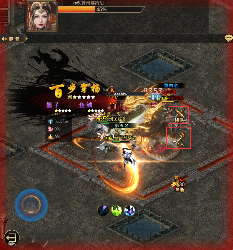 在战斗中你将和在线的势力伙伴们一起打BOSS,战斗一段时间后,系统会根据输出给每个人排名,届时各位主公头上会出现排名,该排名结算会带给战甲玄铁奖励。如果你想提升自己的输出伤害,还可以点击旁边的“团队”或“个人”按钮,花费金子就可以提高啦。