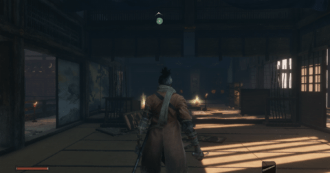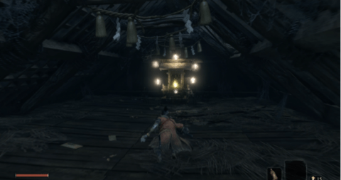 在击杀BOSS【鬼庭形部雅孝(骑马那个)】之后穿过战斗区域走上楼梯,进入建筑,里面会有一个非常友好的武士想与你交谈,暂时先不要理他。使用钩爪爬上那个武士所在房间的木梁,一直到最顶上的那个需要二段跳才能进入阁楼。阁楼里有个金色的发光宝箱,打开之后可以获得佛珠。