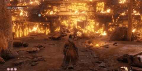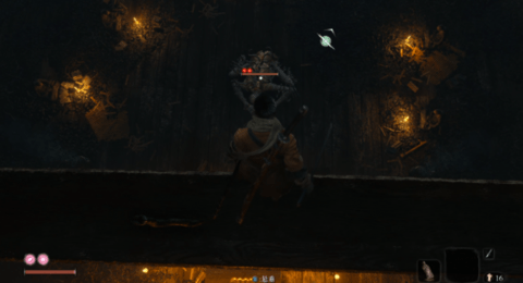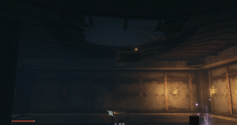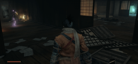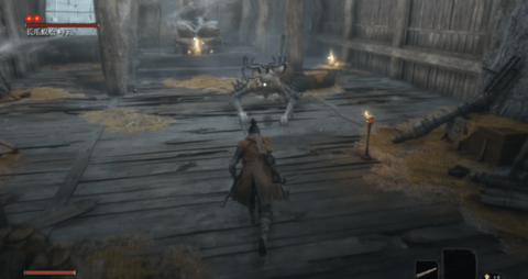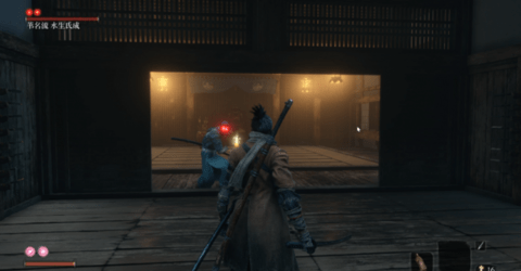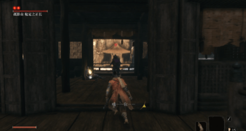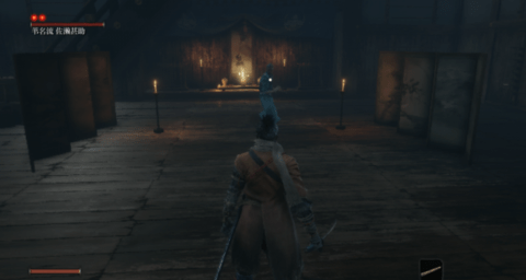 右侧(顶层)分割成了许多小房间,沿路将穿蓝色长袍的武士清理掉,然后会看到天花板上有个洞(有一个钩绳点),然后使用钩绳进入夹层并往前走,再从破洞处跳下,注意该房间中会有许多敌人,不过旁边的门出去就可以看到【天守阁上层苇名流道场】鬼佛,可以在这里休息,鬼佛的旁边有一扇关闭的门,推开门进入房间即可看到这个BOSS。