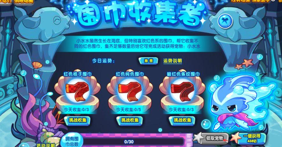 领取VIP后前往VIP广场,点击上方的区域地图,进入光明神殿,进入水灵空间后,可以看到一个小水水,点击过后,活动就弹出来了,活动名字是围裙收集者。如下图: