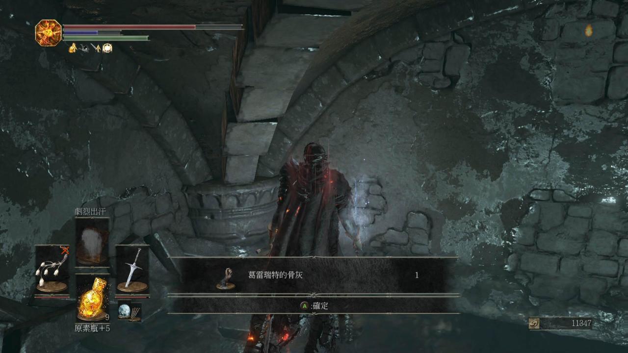 出生后一路前行,除了右边过去一只结晶蜥蜴(杀死掉龙鳞楔形石)之外,并没有什么怕漏掉的,当然如果这里杀死杂兵能掉「圣职者铃铛」的话,装备在左手,可以使用战技回复HP,是前期非常好的节省元素瓶的办法。