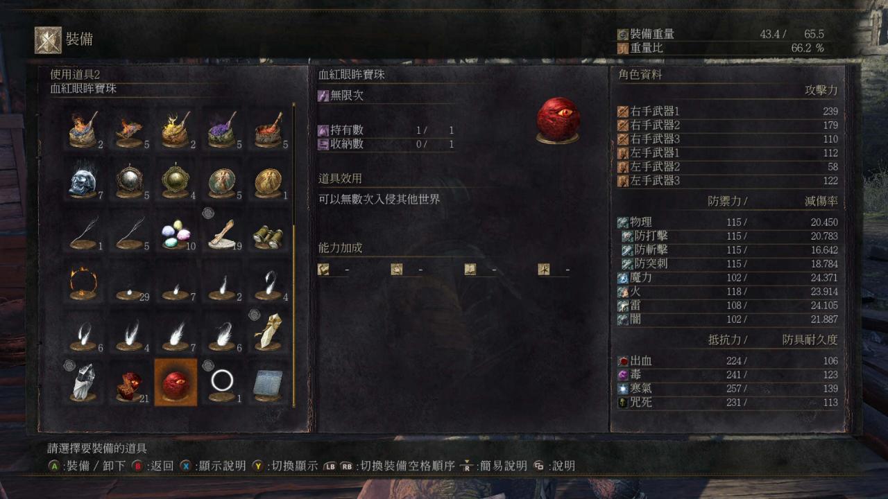 一个战士的负重力一般都比法师强,毕竟人人都不是甘道夫,装备重量超过70%会影响玩家行动的速度、翻滚和精力回复,因此42/65.5就表示目前总装备重量是42,最高负重是65.5,任何已经装备在装备栏的装备(。。。)都会算入负重当中,戒指也有重量。