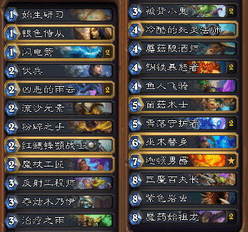 其次是圣骑士,控场牌和优质的返场牌也很多,只要有一个杂毛站场,可以一回合造一只怪物出来。