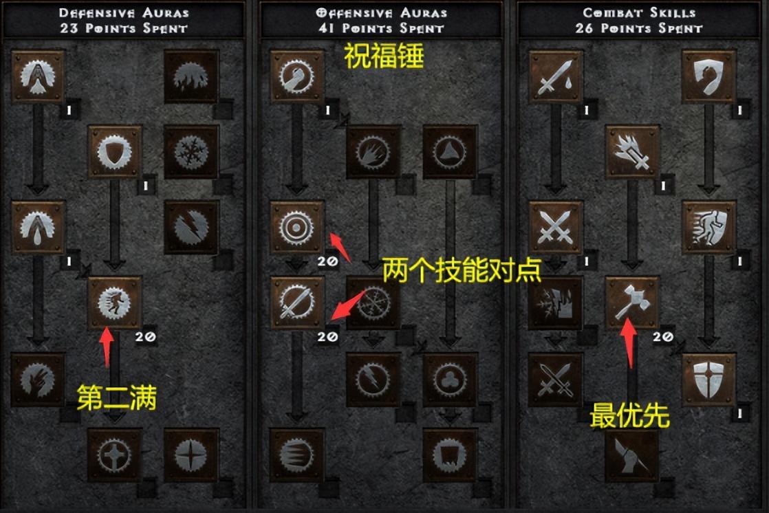 技能方面1级点牺牲,2级点力量光环,然后靠牺牲力量打到6级解锁圣火,期间技能点加给抗火,之后有圣火点圣火没圣火点抗火,直到圣火加满为止。圣火加满之后把圣盾技能解锁,之后再把抗火点满, 点一级热忱,之后的技能点全部投入圣盾就好,别的不用加。属性方面,力量够拿装备就好,先把活力(体能)点到100点,之后点敏捷,配合圣盾开盾之后有75%格挡就行。