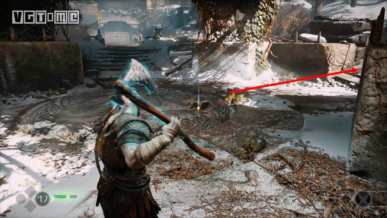 回到奎托斯的家,不要从正前方的大门出去,在下图位置右转可以看到第一个玩具1。