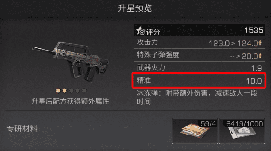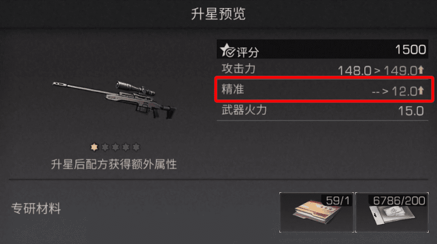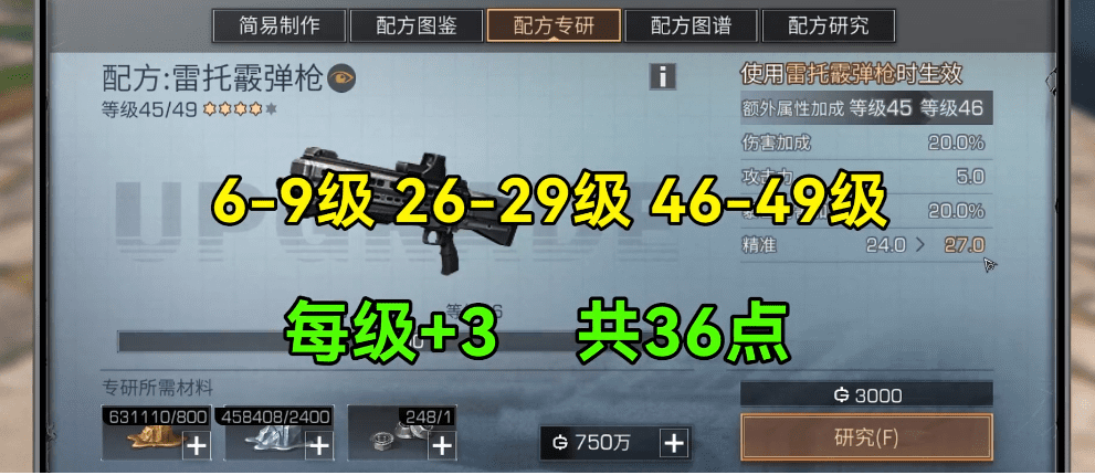 除了可以购买精准值较高的步枪外幸存者还可以通过专研配方来提高精准值,在步枪专研到6-9级、16-19级、26-29级、36-39级、46-49级时都可提高1点精准,总共20点。