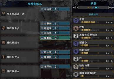 比较偏向于毕业的一套配装。满会心配合匠3的白斩+达人艺,理想状态下可以长时间保持白斩。集中3是为了提高攒瓶子的速度;冰属性攻击强化5,可以将这把盾斧的冰属性提高到620;防性1是为了在红盾的前提下,保证大部分攻击之后都能化解。珠子的微调方面,可以将1颗冰结珠换成超心珠,具体看怪的弱冰程度。又或者说,如果觉得匠3配合达人艺还是不够用,也可以换成匠珠,具体看个人选择。