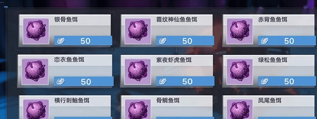 商店里面看鱼饵就可以分辨出鱼的品质,没有鱼饵的就是绿色鱼。对于鱼饵我个人推荐是,无论钓蓝色鱼还是紫色鱼都用紫色鱼饵,当然你用蓝色也行,大部分时候还是看运气。